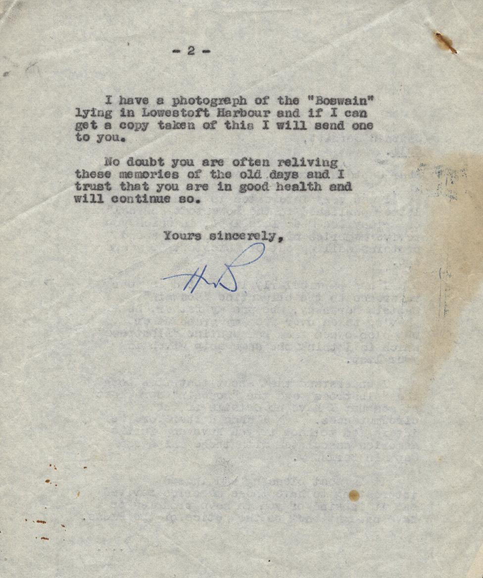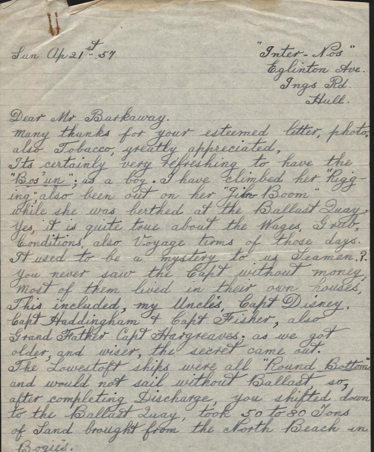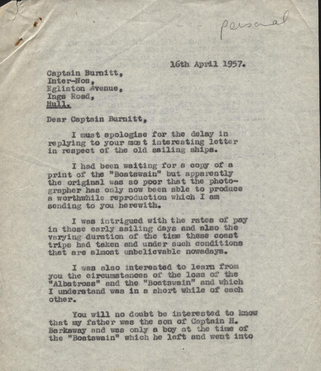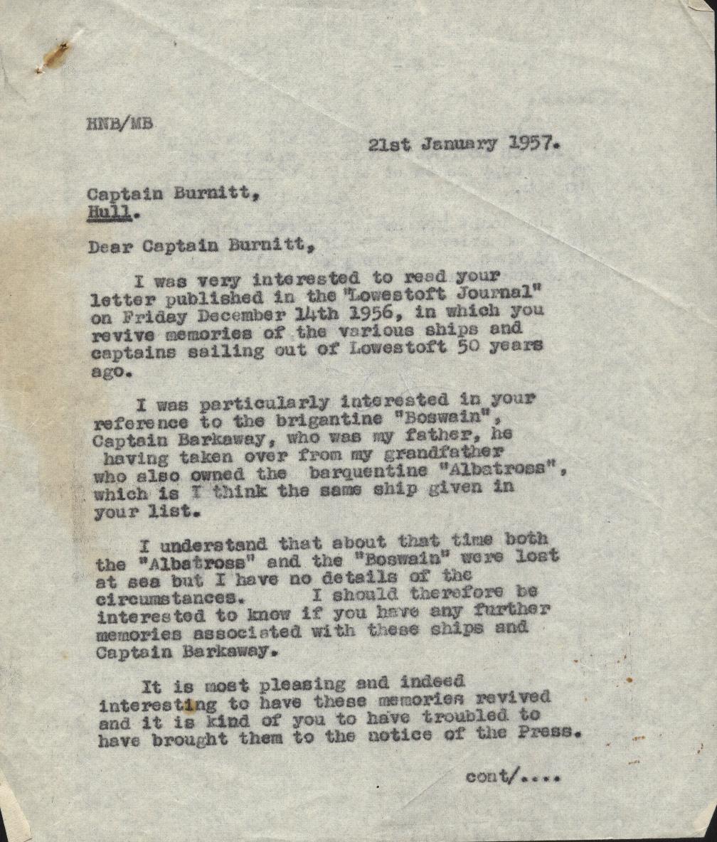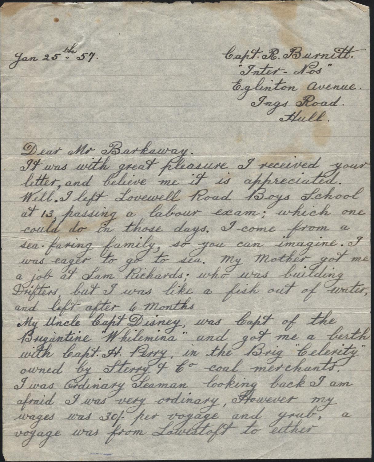 Copies of correspondence between Herbert Nathaniel Barkaway (1903-1976) and Capt. Reginald Burnitt regarding life working on the East Coast sailing vessels in the early 1900's