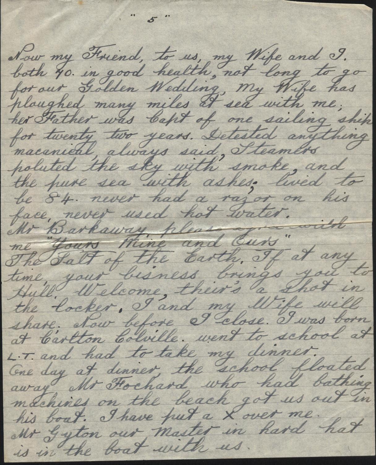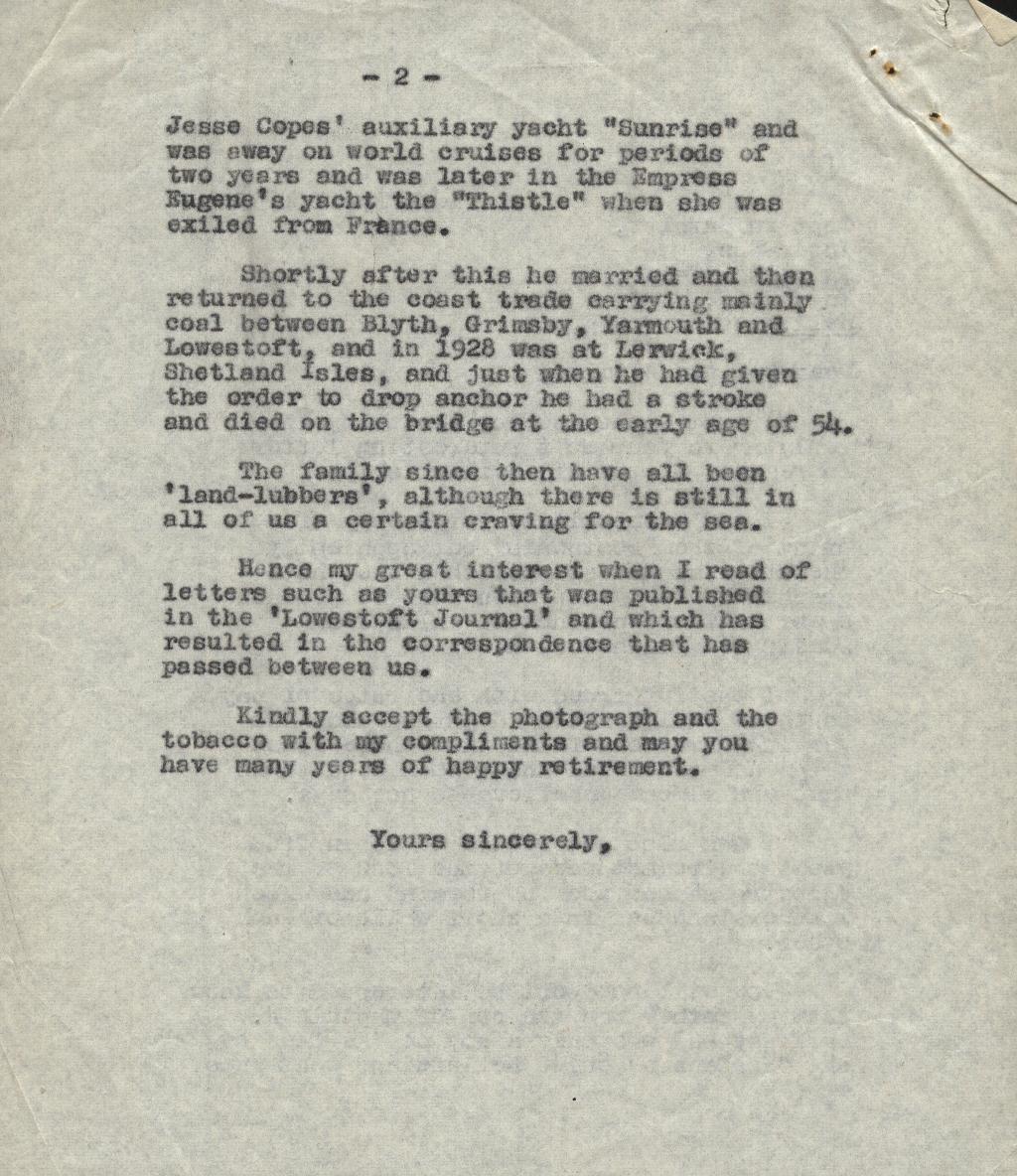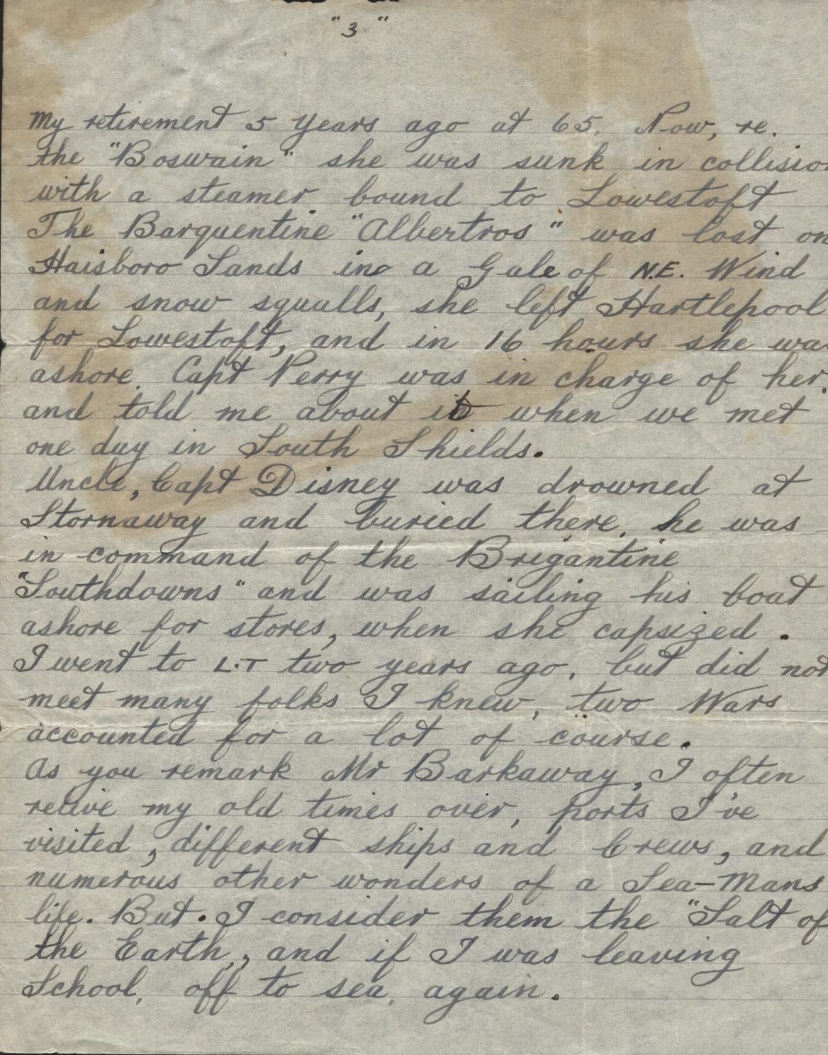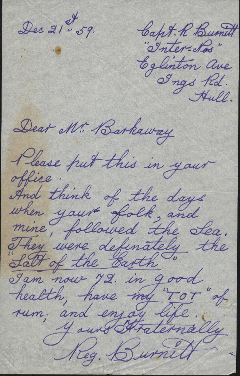 Copies of correspondence between Herbert Nathaniel Barkaway (1903-1976) and Capt. Reginald Burnitt regarding life working on the East Coast sailing vessels in the early 1900's